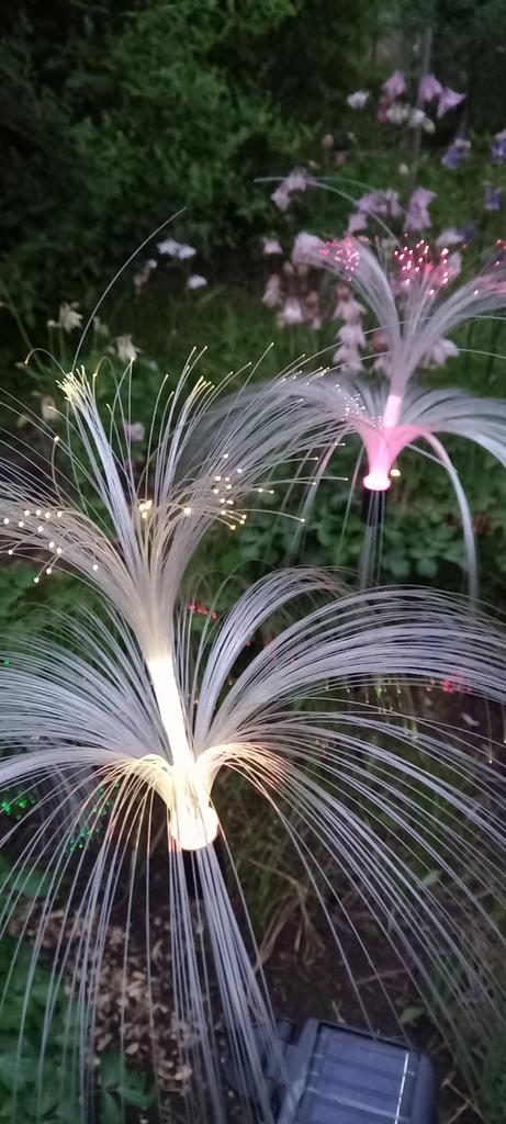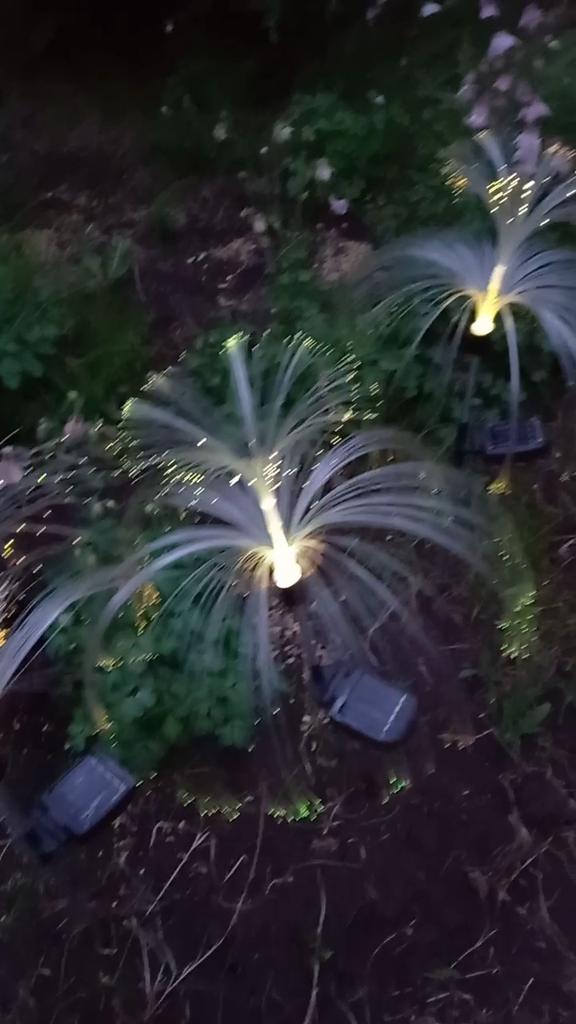 ¡Las lámparas de medusas muy brillantes y que cambian de color encajan perfectamente en el jardín de primavera! Un día soleado fue suficiente para cargarlos, ya que funcionan con baterías solares. Son muy fáciles de montar. Todos los componentes estaban disponibles.