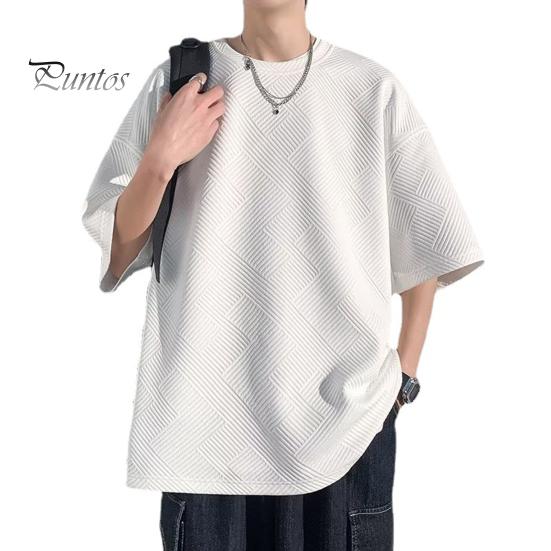 Camiseta de verano para hombre, cuello redondo, holgada, de largo medio, de color liso, con textura de gofre, talla grande, media manga, estilo japonés, ropa de calle para exteriores