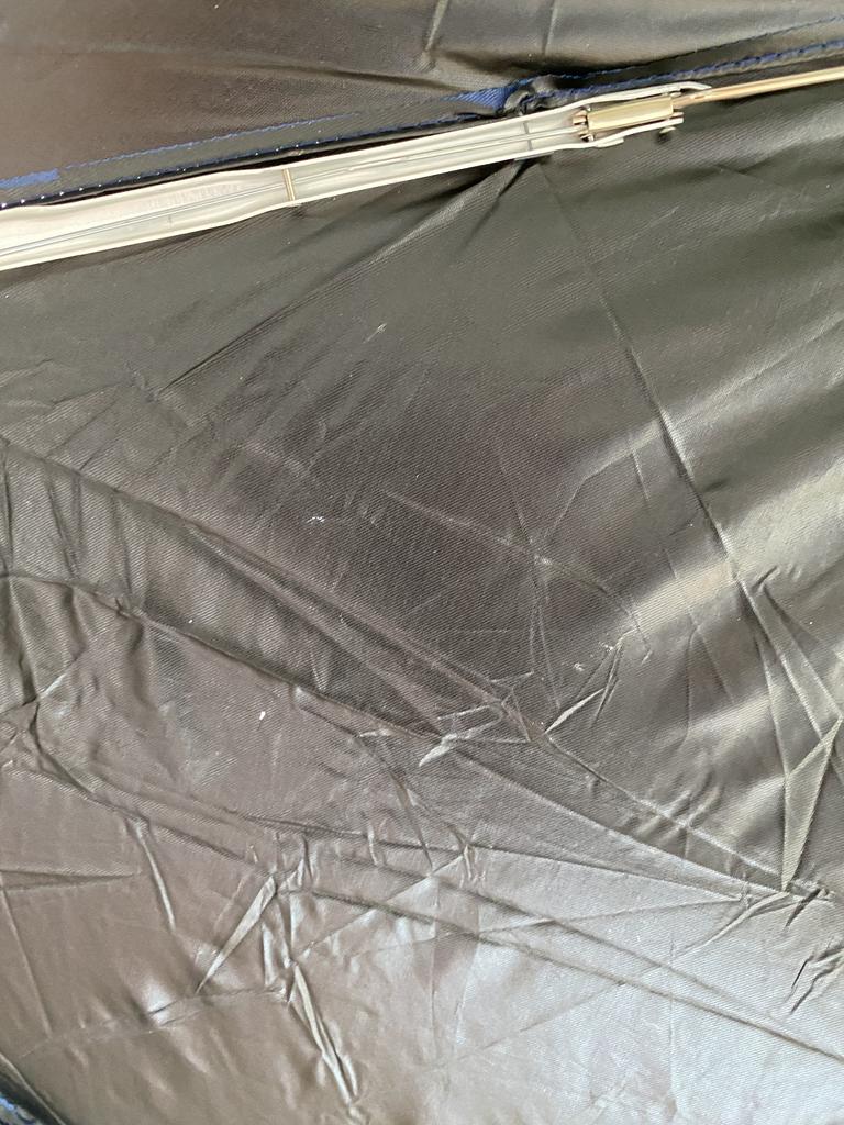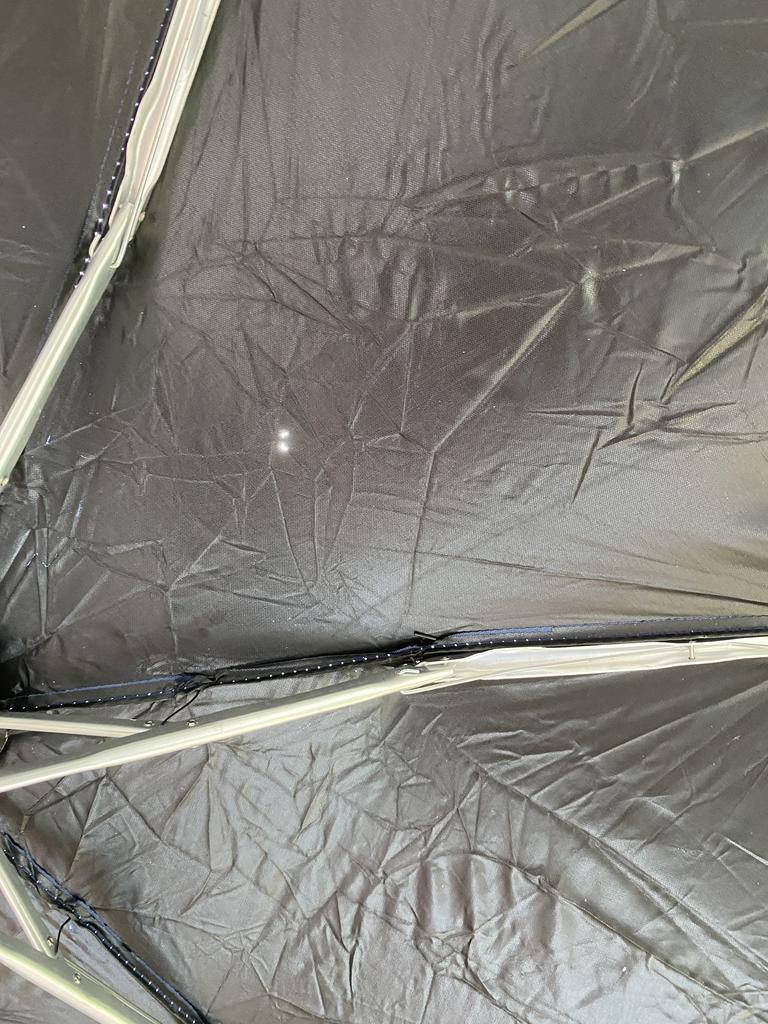 El paraguas vino con agujeros en la capota. Se abre con fuerza (difícil de arreglar).