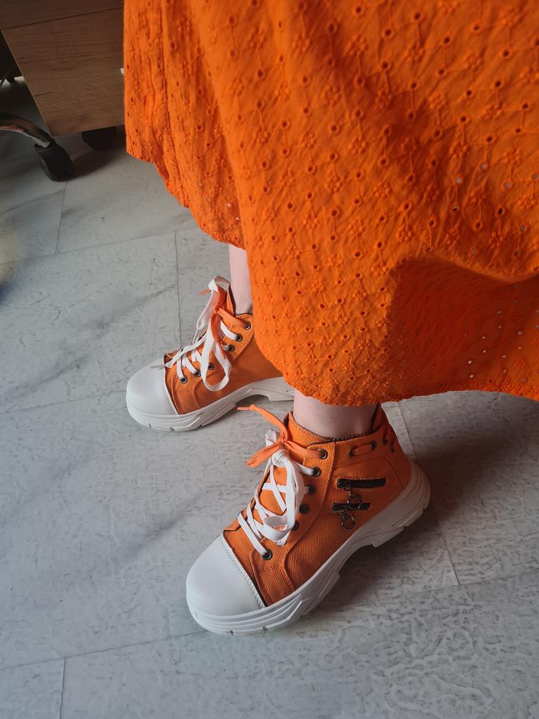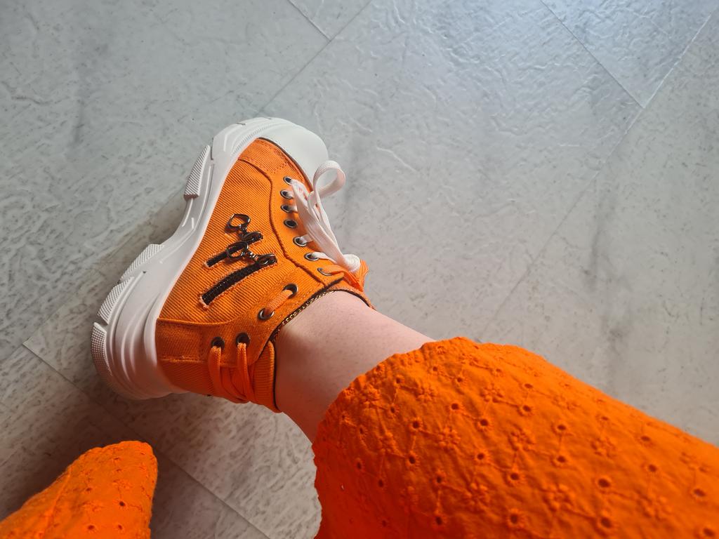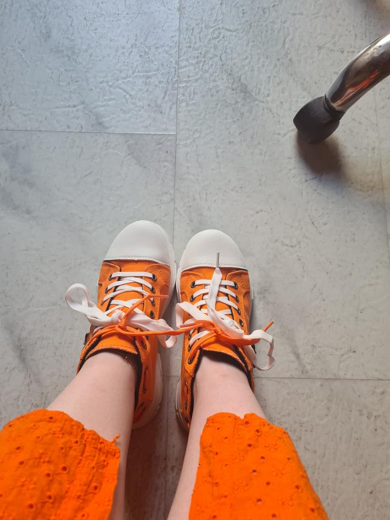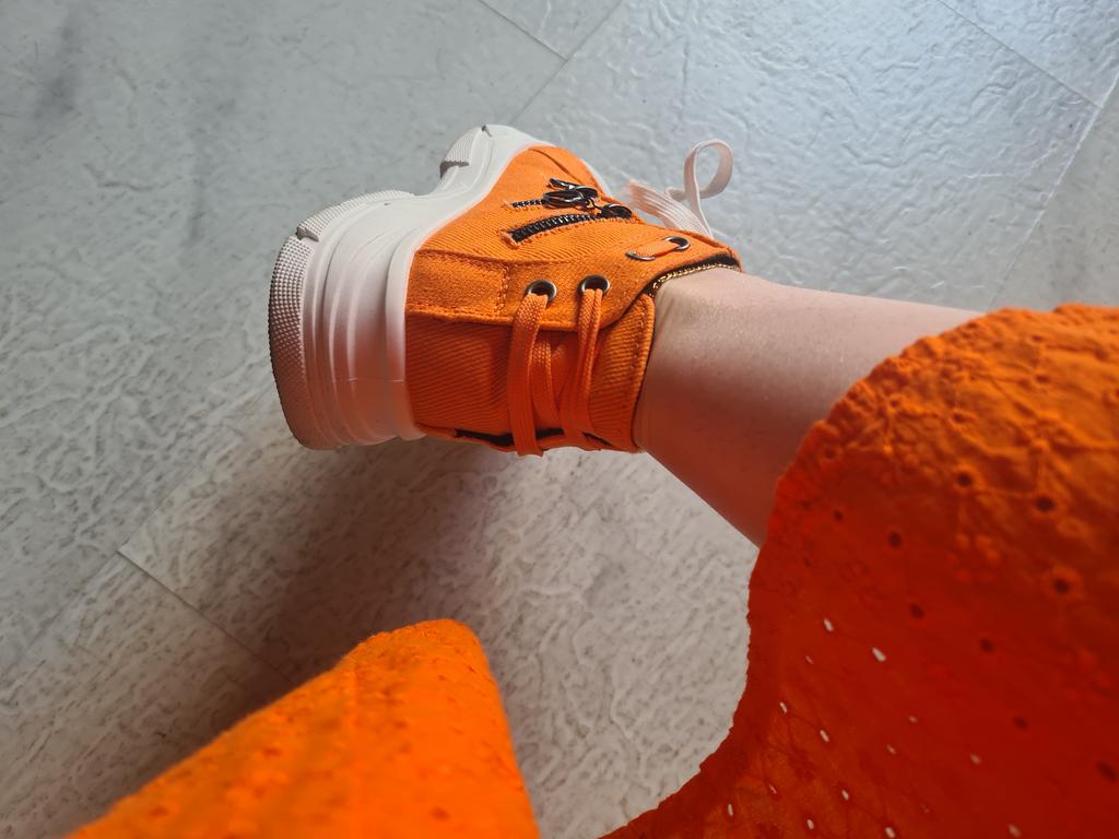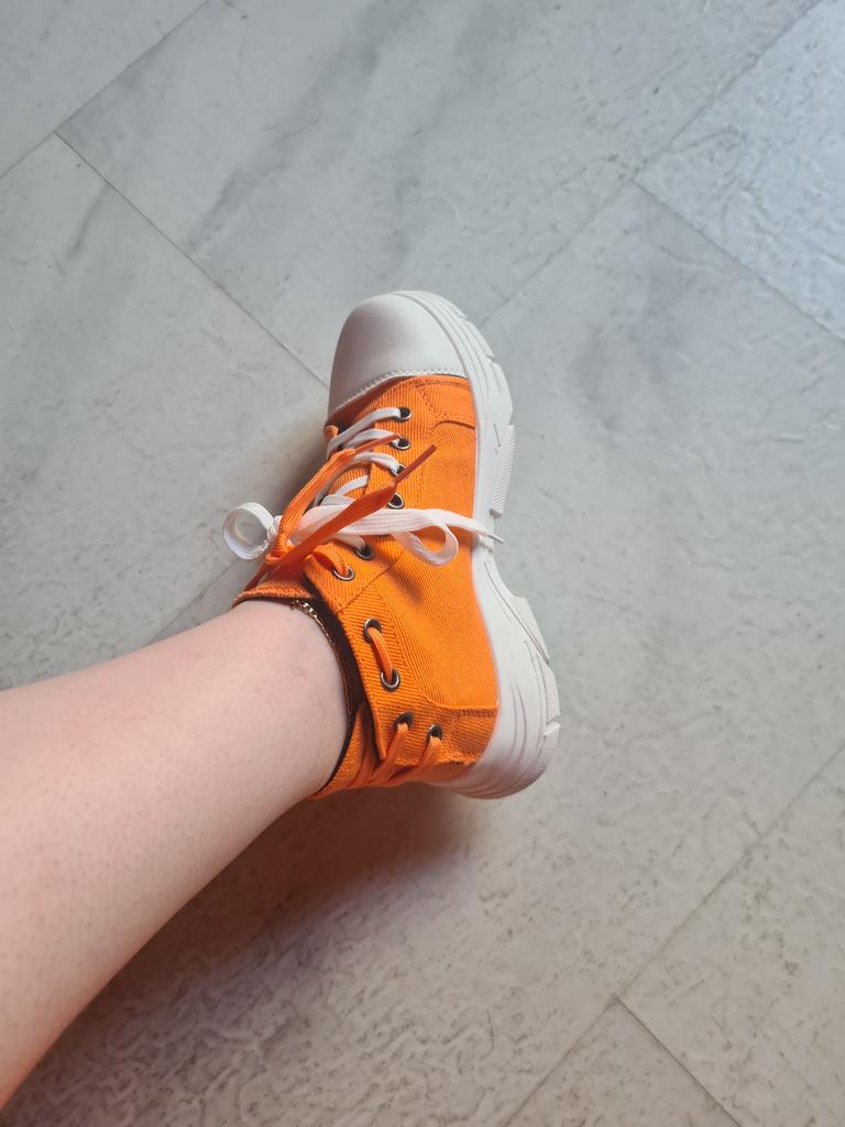 Calzo talla 37, pedí 38 para poder llevarlo con calcetines si fuera necesario. El color es muy llamativo. Se puede llevar con cualquier clima excepto con lluvia y nieve.
