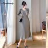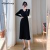 Vestido de punto estilo coreano para mujer, vestido de corte A, cuello en V, negro, beige, caqui, vestido de punto, manga larga, elegante, moda, cálido, otoño e invierno