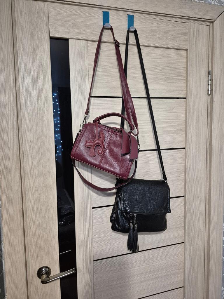 Los ganchos de acero inoxidable quedaron perfectos en la puerta interior del dormitorio. La puerta cierra perfectamente con ellos. Tengo estantes especiales para bolsos en el armario. Pero la mayoría de las veces simplemente pongo el bolso en una silla cerca del tocador. Ahora podré colgarlo en un gancho.