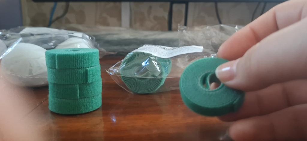Lo uso según lo previsto (para sujetar plantas a soportes). Muy conveniente, pero sería mejor que fueran 10 unidades de 1 m, en lugar de 10 m en 1 rollo.