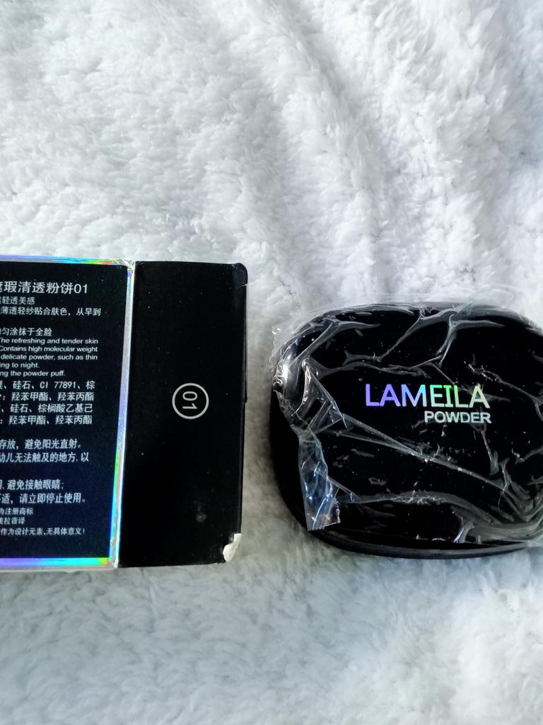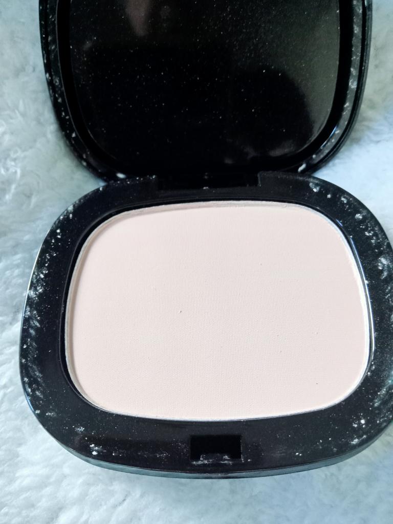 Polvo para fijar el maquillaje. En la caja hay dos colores, uno claro y otro ligeramente más oscuro. En el tercer compartimento hay una esponjita. Al tacto es fino, suelto y cubriente.
