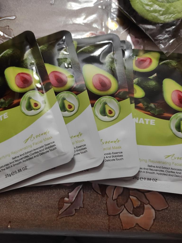 Un juego de mascarillas😊 La mascarilla está bien empapada y literalmente gotea cuando se quita. La esencia misma es transparente. La consistencia es similar a un gel líquido.. Elija entre aguacate (5 piezas) para hidratar y nutrir la piel.. Después de la mascarilla, la piel queda suave y delicada. Ella está bien humedecido. Esta mascarilla no me provocó una reacción alérgica.