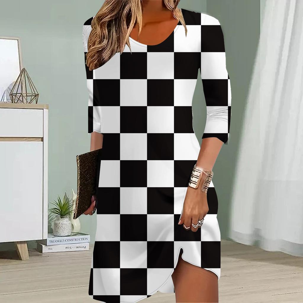 Women Casual Dress Autumn Black and White Squares Print Dresses For Women O-neck Short Sleeve Dress Plus Size
