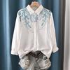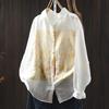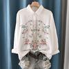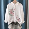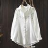 Primavera Otoño Top Blanco Camisas de Hilo de Algodón de Doble Capa Mujer Cuello de Solapa Manga Larga Blusas Estampadas