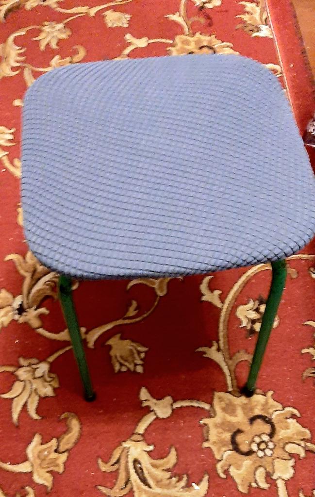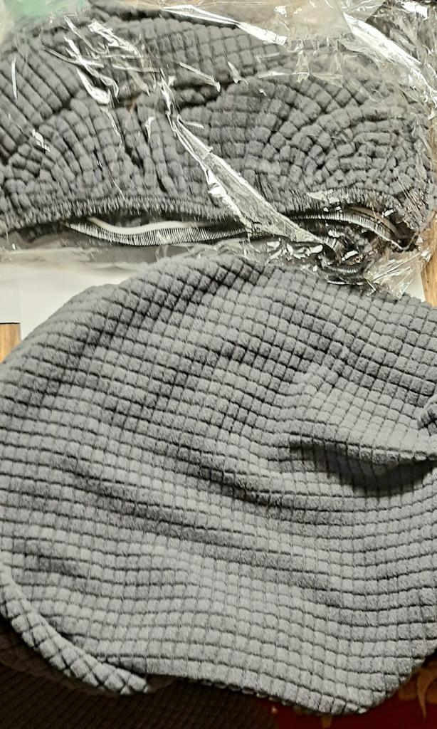 Funda cuadrada gris para silla, tejido liso y con pequeñas inserciones esponjosas. Gracias por el producto.