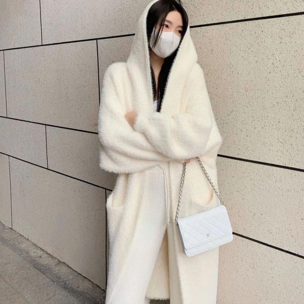 Fashion Hooded Long Cardigan Women Knitted Long Sleeve Winter Korean Style Clothes Long Sleeve Knitwears Fall Pink