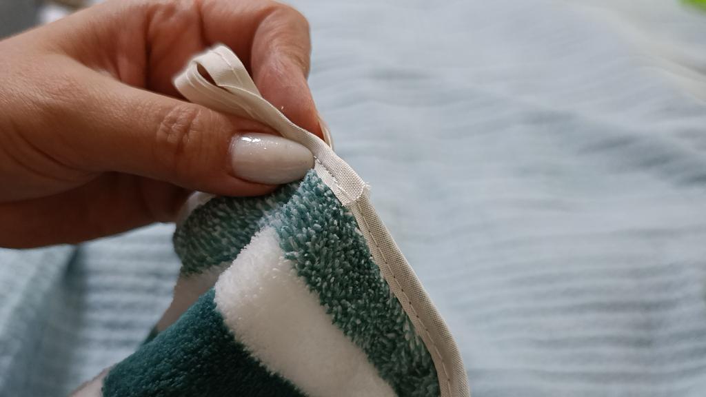 La toalla está etiquetada como absorbente, pero la toalla no absorbe. La toalla es como piel artificial o como una manta. No la recomiendo. Donde está cosido, la costura es de mala calidad.