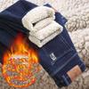 Invierno Vaqueros Cálidos Ajustados para Hombre Moda de Negocios Pantalones Vaqueros Gruesos Elásticos con Forro Polar Marca Negro Azul
