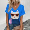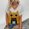 Women's Retro T Shirt Anime Cat Graphic Girl Clothes Summer V-Neck Short Sleeve Tees Female Harajuku Streetwear Oversized Blouse