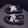 Fashion Thick Soled Sandals for Women Shoe 2024 Summer New Rome Broadband Cross Ankle Buckle Sexy Open Toe Printing Beach Sandal
