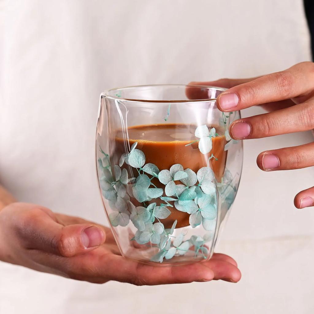 1pc 350ml Double Wall Glass Cup Artificial Flower Decorated Coffee Cup Milk Mug Heat Resistant Tea Cups Glass Mug Kitchenware