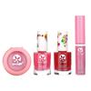 Ingredients: Nail polish: purified water (water), acrylate copolymer, polyurethane polymer. May contain ingredients (+/-): mica (CI77019), iron oxide (CI77491, CI77492, CI77499), titanium dioxide (CI77891), carmine (CI75470), ferric ferrocyanide (CI77510), chromium oxide green (CI77288), Ultramarine blue (CI77007), polyethylene terephthalate (glitter). Lip gloss: Coconut (Cocos nucifera) oil, beeswax (Cera alba), cacao (Theobroma cacao) seed butter, sunflower (Helianthus annuus) seed oil, tocopherol (vitamin E), mica (CI77019), titanium dioxide (CI77891), carmine ( CI77420). Eyeshadow: Mica, Talc, Magnesium Stearate, Magnesium Myristate, Polydimethylsiloxane, Ethylhexyl Palmitate, Silica. May contain (+/-): CI77019, CI77492, CI77499, CI75470, CI77077, CI77742, CI77420.