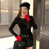 Diseño de otoño e invierno de empalme de colores contrastantes, cuello redondo, cachemira versátil de manga larga para mujer, para llevar debajo con tops petite