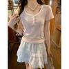 Blue and white striped short-sleeved right shoulder women's T-shirt spring and summer 2024 new chic niche design slim short top