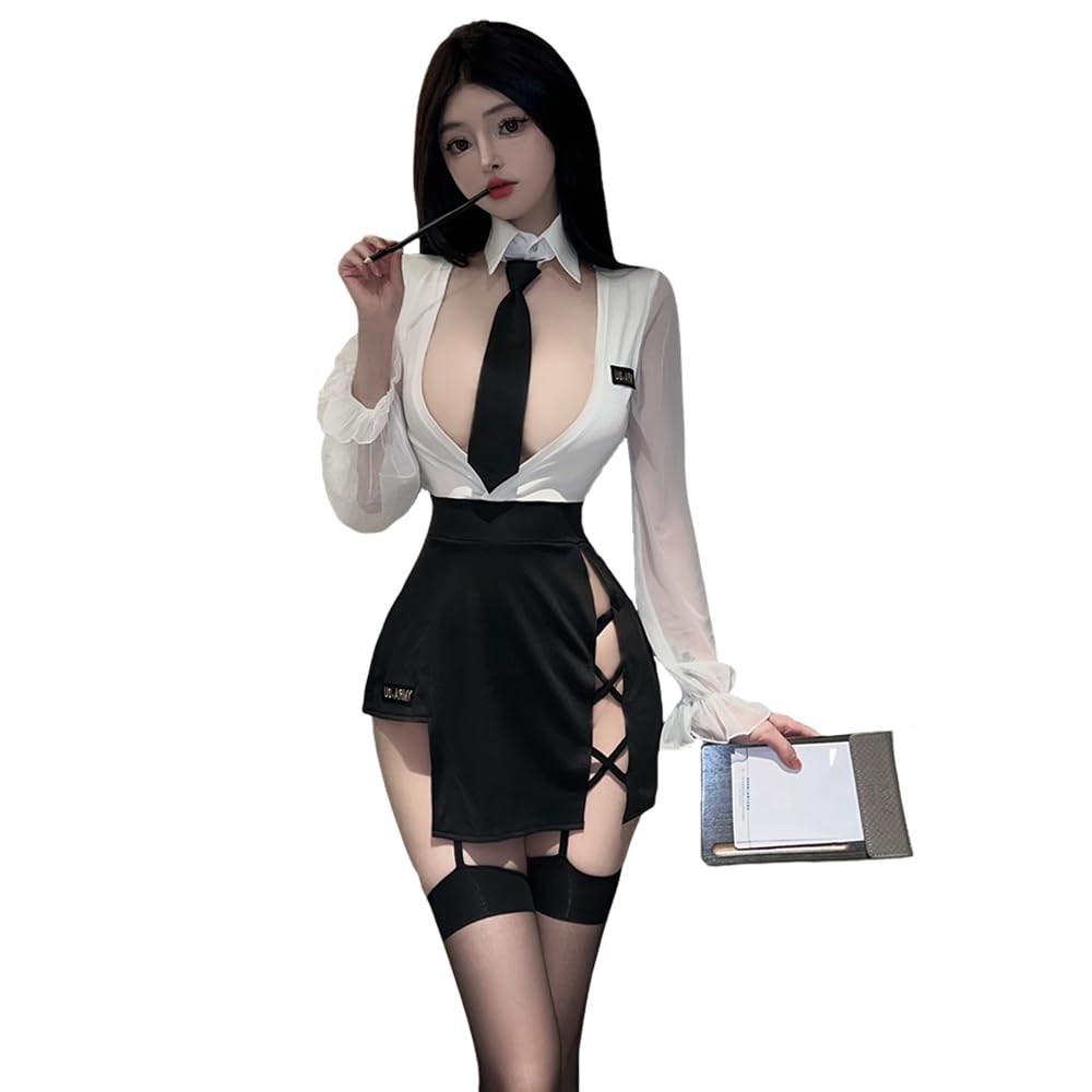 Secretary OL Female Teacher Chest Open Costume Sexy Erotic Extreme Halloween Costume Open Back Long Sleeve See Through Slit White Black Costume Outfit