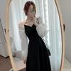 Women's Hepburn Style V-Neck Retro Black Dress - 2024 Spring/Autumn Over-the-Knee Long Skirt