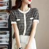 Ice Silk Knitted Blouse, Small Fragrance, Short-sleeved T-shirt, Women's Summer Thin Round Neck, Fashionable Temperament, Loose Striped Shirt