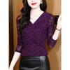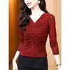 Primavera Nuevo Cuello en V Lunares Temperamento Plisado Slim Manga Larga Malla Camiseta Base Versátil Jersey Camiseta Top