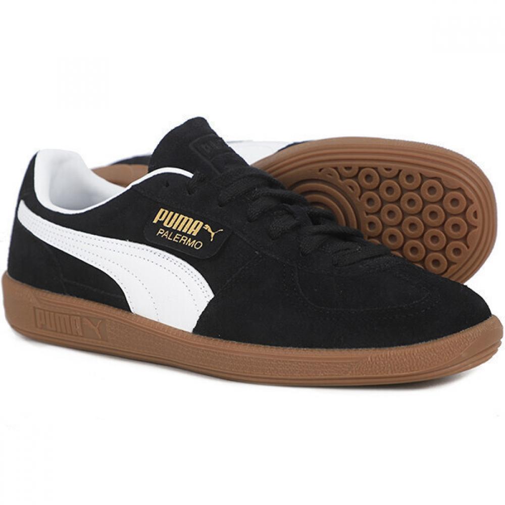 The PUMA Palermo is a sports sneaker featuring a suede upper and classic T-Toe structure. Designed in a stylish black and white color scheme, it is complemented by a gum sole for a sleek aesthetic. The leather foam strip and foil-printed PUMA branding details stand out, making this product suitable for wear anywhere.