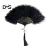 Hecho de precioso encaje y plumas, con varillas de plástico caladas y anillos en U de metal. Su volumen llamativo y su diseño intrincado lo convierten en un accesorio destacado.. El abanico presenta patrones elegantes y un colgante de borla, lo que lo convierte en un regalo encantador para mujeres y niñas..