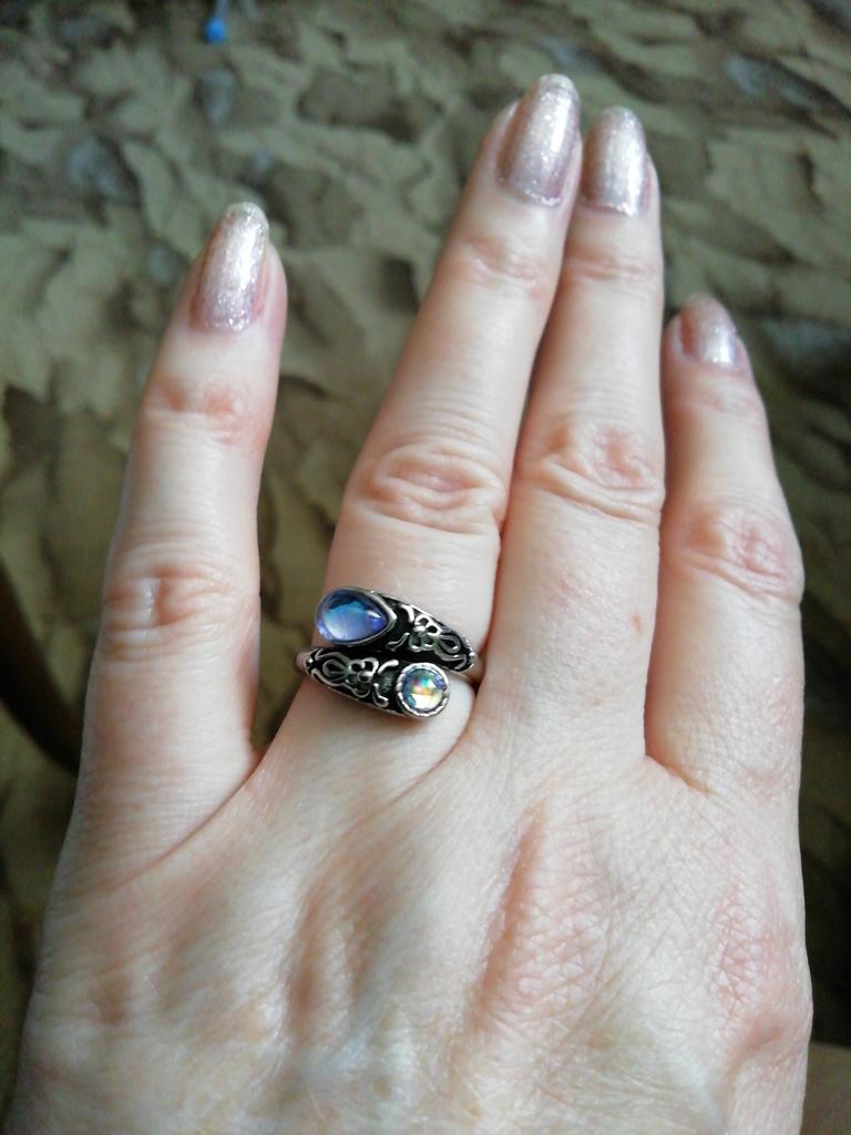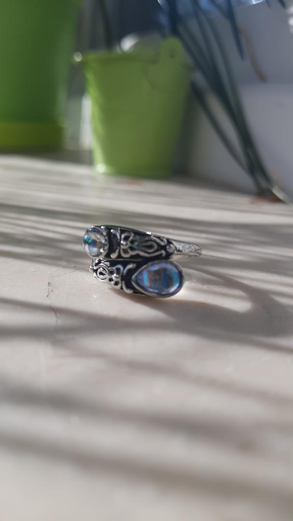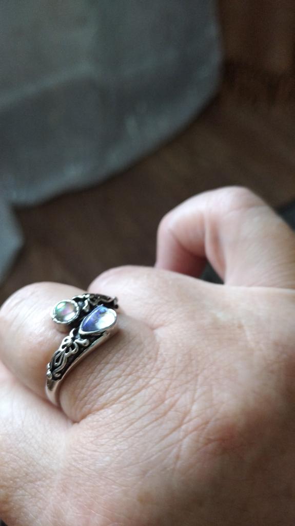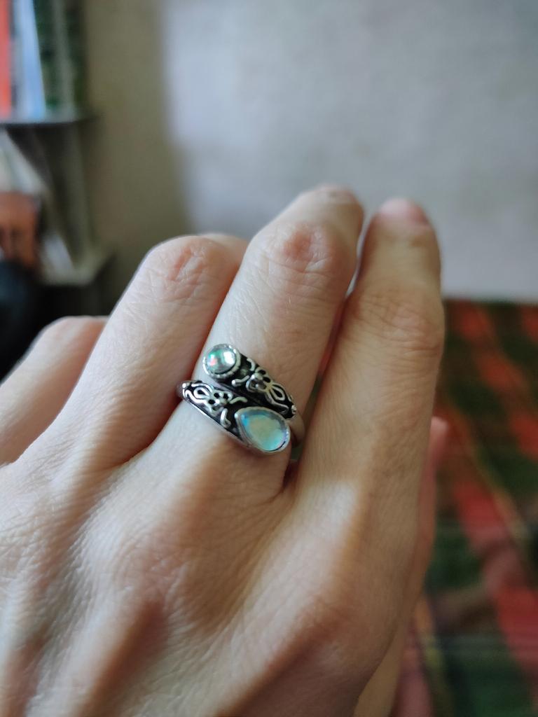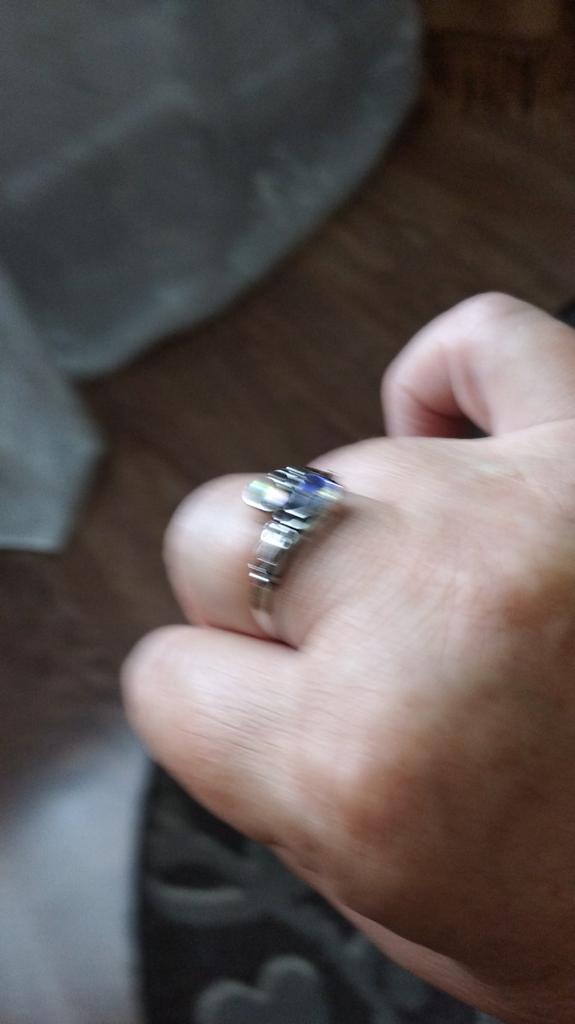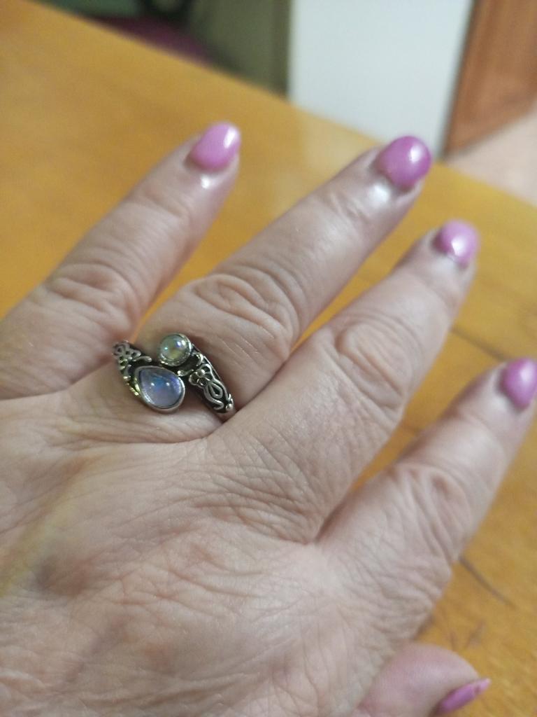 Un anillo muy bonito, se ve caro, como de plata con piedra lunar u ópalo, todo como en la foto. El tamaño se puede cambiar, lo cual es conveniente. Estoy satisfecha con la compra, gracias :)