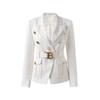 Esta elegante chaqueta de traje entallada para mujer está diseñada para el guardarropa europeo moderno, con un llamativo esquema de color blanco y negro.. Fabricado con poliéster de alta calidad, garantiza un ajuste cómodo y favorecedor.. La chaqueta está acentuada con una elegante hebilla metálica, añadiendo un toque de elegancia y estilo contemporáneo a cualquier atuendo.. Perfecta tanto para entornos profesionales como informales, esta chaqueta combina sin esfuerzo tendencia y sofisticación.