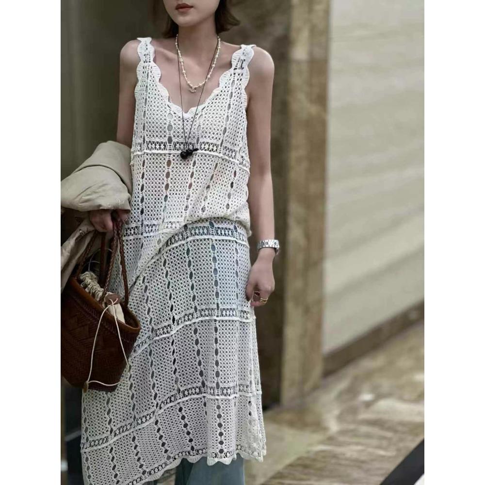 DIMANAF 2025 New Dress Women Knitting Beach Sleeveless Lace Long Hollow Out Sexy Vest O-Neck Hollow Summer Style Tops Tees Loose Basic Blue