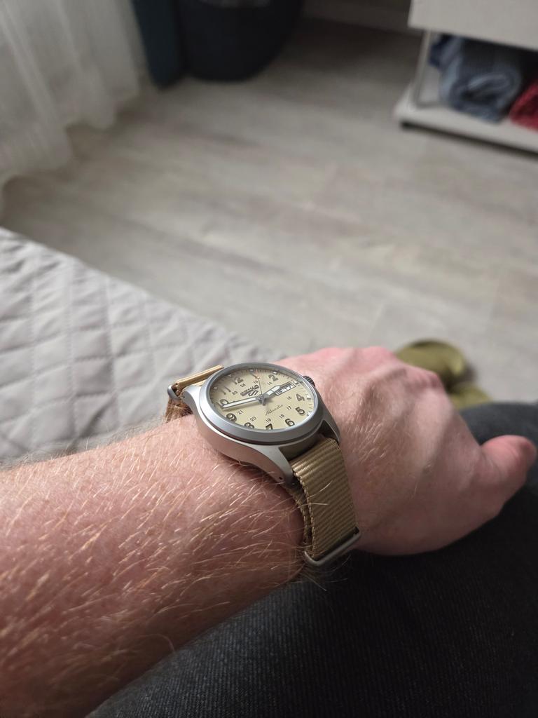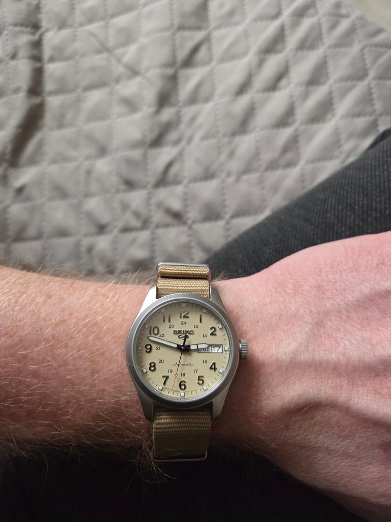 La correa de nailon, disponible en un color beige a juego, proporciona comodidad y durabilidad.. Con una resistencia al agua de 100 metros, este reloj es adecuado para el uso diario y actividades acuáticas ligeras.