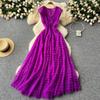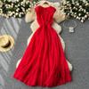 Vestido Francés para Mujer Cuello en V Malla Plisada Pesada Cintura Imperio Abullonado Pastel Vestido Largo