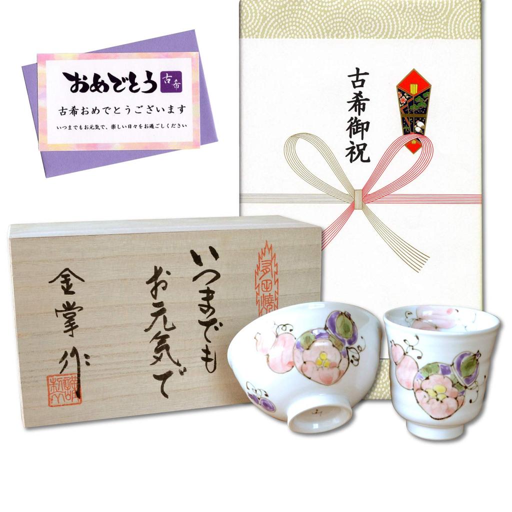 Celebración del antiguo regalo de amuleto de la suerte para buenos tiempos, salud, taza de té, cuenco de arroz y té Arita de seis flores con tarjeta de regalo y mensaje en caja de madera