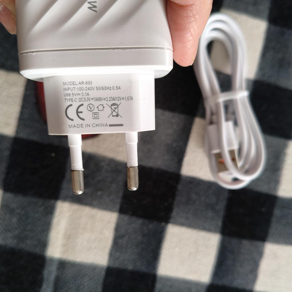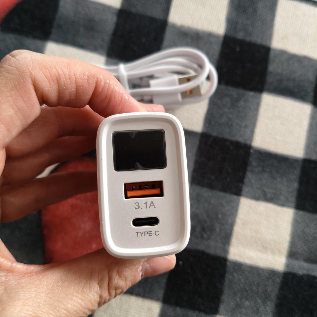 * Cable USB de carga rápida con conector USB-C * 💥𝗟𝗶𝗲𝗳𝗲𝗿𝘇𝗲𝗶𝘁 18 días a Alemania 💥𝗟𝗶𝗲𝗳𝗲𝗿𝘂𝗺𝗳𝗮𝗻𝗴 En el volumen de suministro se incluye 1 cable de carga USB (compuesto por enchufe y cable de carga). El dispositivo está disponible en negro o blanco como enchufe estadounidense o enchufe europeo. Pedí el cable de carga en blanco para la variante de la UE. 💥𝗤𝘂𝗮𝗹𝗶𝘁ä𝘁 El enchufe es adecuado para enchufes alemanes. Tiene una pantalla donde se muestran diferentes indicadores de corriente . Además, en el conector se puede enchufar un puerto USB común o un puerto USB-C, como tienen ahora todos los dispositivos comunes.. Cuando se conecta un dispositivo, se muestra el número de vatios o amperios correspondientes (desafortunadamente, no conozco tan bien las unidades de medida en el campo de la electricidad). Se supone que es un cable de carga rápida. Pero cuando cargo mi teléfono, no se carga tan rápido como con el cable/enchufe que venía con mi smartphone Samsung.. Para la composición del material : el plastico 💥𝗙𝗮𝘇𝗶𝘁 Cable de carga rápida muy práctico, donde se puede conectar cable con USB o USB-C. Se pueden cargar 2 dispositivos simultáneamente con este enchufe. Súper práctico. 😉 ✌️ Se puede elegir entre la variante estadounidense o la variante europea. Además, se puede elegir entre los colores negro y blanco.