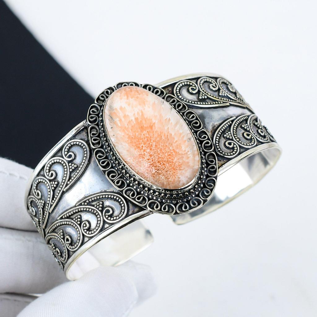 Natural Orange Scolecite Gemstone Handmade 925 Sterling Silver Cuff Bangle, Orange Scolecite Bangle,For Wife, Unisex Bangle, Gift For Her
