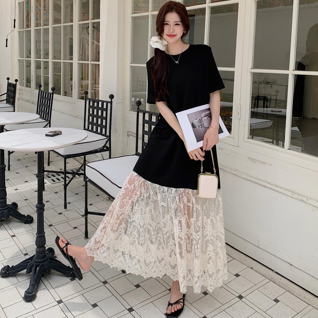 Dimanaf Vestido de verano de talla grande para mujer, holgado, vintage, informal, básico, de gran tamaño, con encaje empalmado, largo, 2025