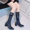 Botas de Mujer Nuevas Botas Denim Hasta la Rodilla con Tacón Grueso y Cremallera Lateral Puntiaguda Botines Denim Zapatos de Mujer Tacones Altos