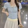 Camiseta de Manga Corta de Estilo Deseo Puro Falso de Dos Piezas para Mujer En Verano Ropa de Mujer Nuevo Top Corto de Orejas Negras