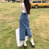 Elevate your wardrobe with this stylish high-waisted A-line denim skirt, perfect for adding a retro touch to your spring and autumn outfits. Crafted from quality denim, this long skirt features a chic front split for added flair and ease of movement. With practical pockets seamlessly integrated into the design, you can carry your essentials effortlessly. Ideal for pairing with your favorite tops and shoes, this skirt is a versatile addition to any fashion-forward woman's collection.
