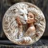 Impresionante Arte de Mujer y León Blanco - Letrero Redondo de Metal - Impresión HD, Impermeable, Resistente a la Intemperie, Decoración de Pared
