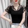 Camiseta de Verano de Encaje con Cuello en V y Manga Corta para Mujer Color Sólido Slim Tejido de Punto Camiseta Básica