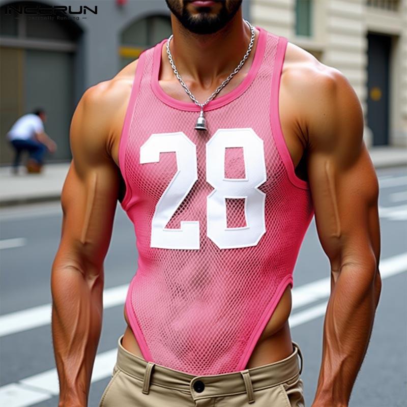 INCERUN Men Sleeveless Letter Print Mesh Bodysuits See Through Fitted Briefs Jumpsuits