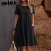 GMXIA Vestidos casuales de cintura alta con cuello redondo y estampado de colores sólidos para mujer, moda de verano y primavera
