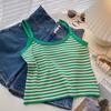 Women's Casual White&Green Striped Knitted Crop Top Korea O-Neck Female Multi Color Optional Striped Knitted Tank Top