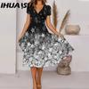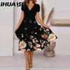 IHUASU Vestido midi de talla grande con escote en V, manga corta, dobladillo alto, informal, estampado floral colorido