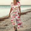 Moda Vestido de Playa de Verano para Mujer con Cuello en V, Manga Corta, Algodón y Lino, Estampado Floral Vintage