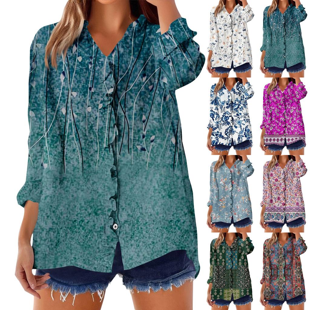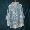Women's Loose Ruffled Floral Print Stand Collar Long Sleeve Cotton And Linen Top