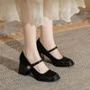 Temperament Mary Jane one word with high heels women's thick heel square head single shoes with skirt small leather shoes