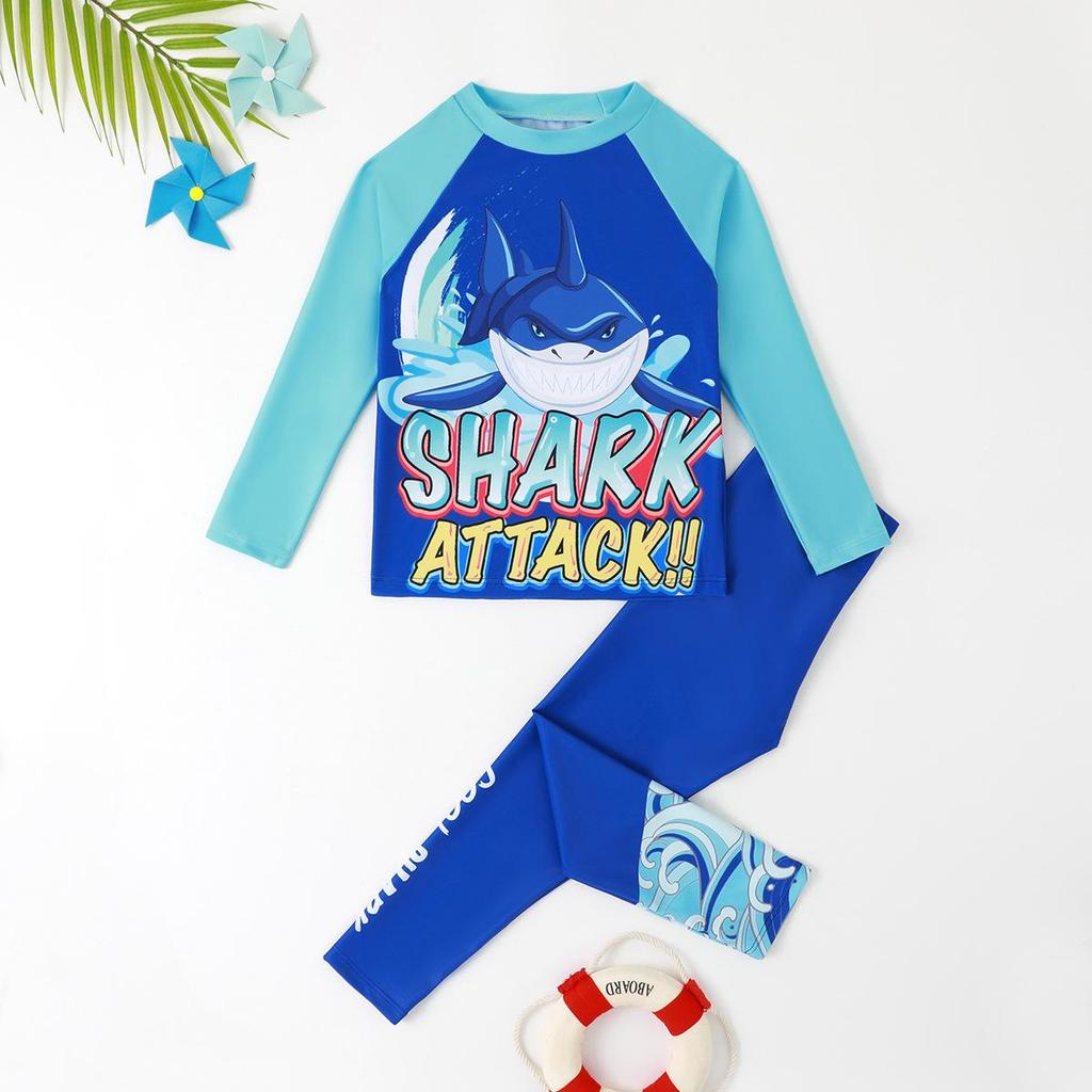 Traje de baño de dos piezas de manga larga con estampado de tiburones para niño - Estilo 2025