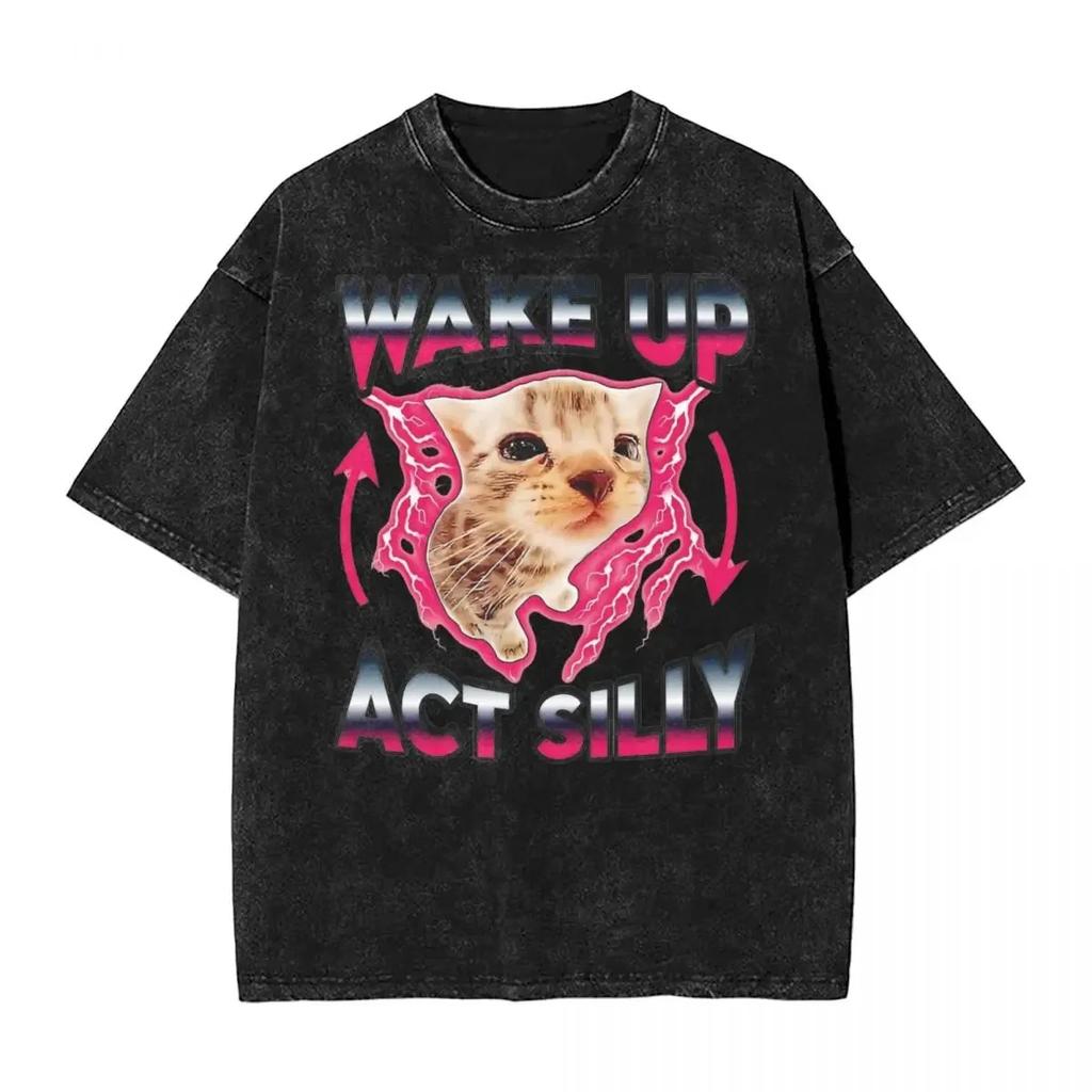 Washed T Shirts Wake Up Act Silly Cat Fashion T-Shirts Oversize Streetwear 100% Cotton Printed Tops Tee Shirt Men Women